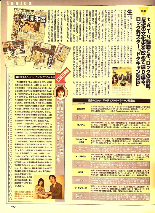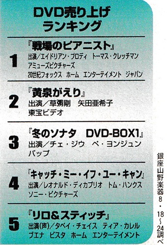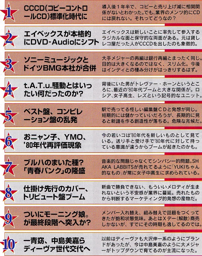 ![]() ビョーク、4thアルバム『ヴェスパタイン』発表 ![]() 今週も1位は『千と千尋の神隠し』。果たしていつまで続くか。