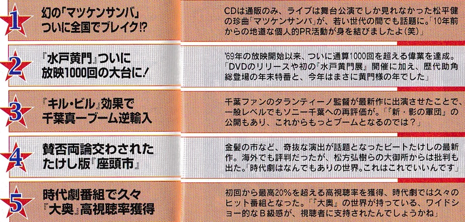 ![]() 北野武の『座頭市』もこの年か。心の準備もせず映画館で観てド肝を抜かれた。