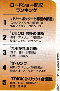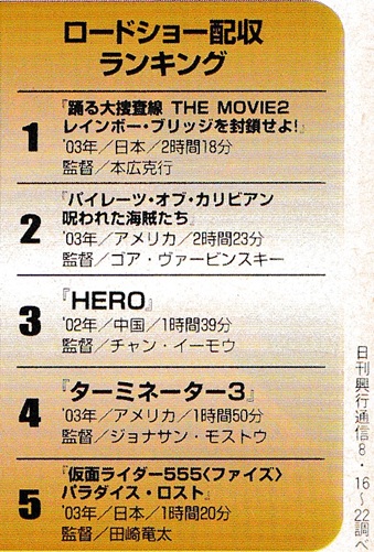 ![]() なんとなく懐かしい気もする ![]() 今週の人気ロードショー配収ランキング 『千と千尋』が初登場1位に